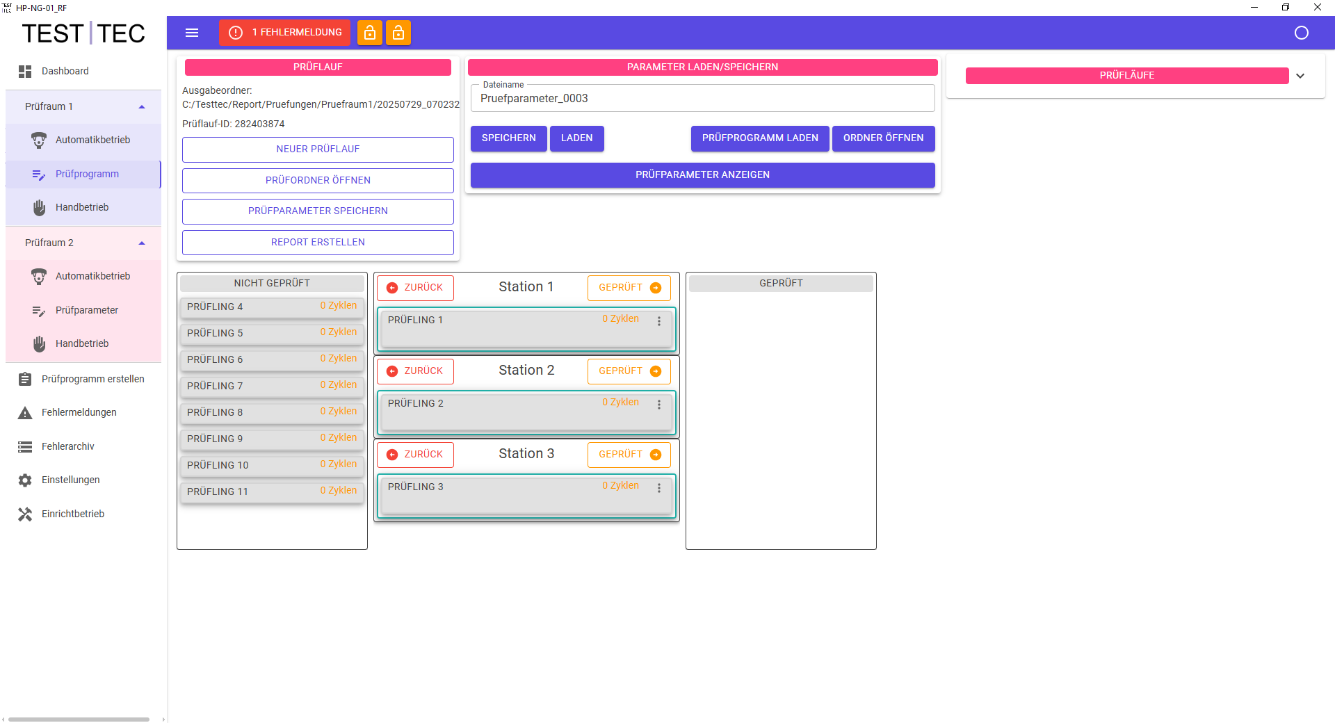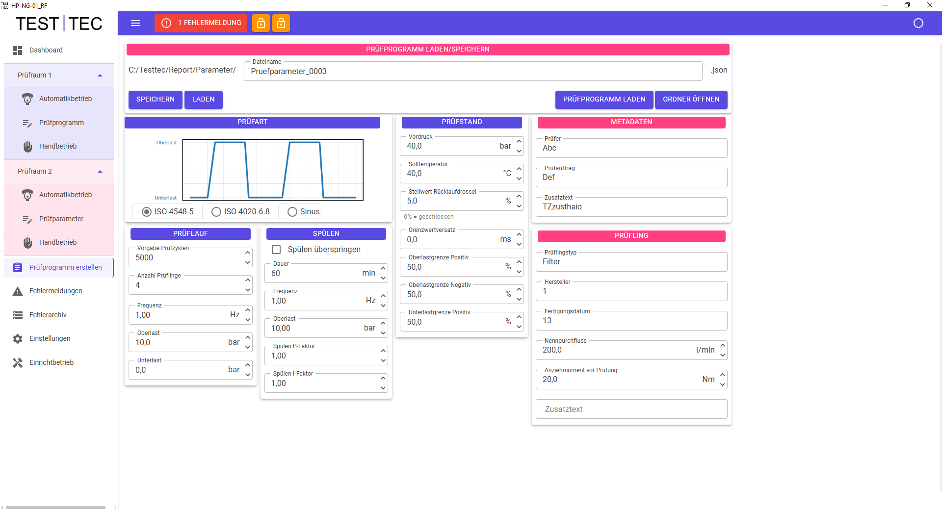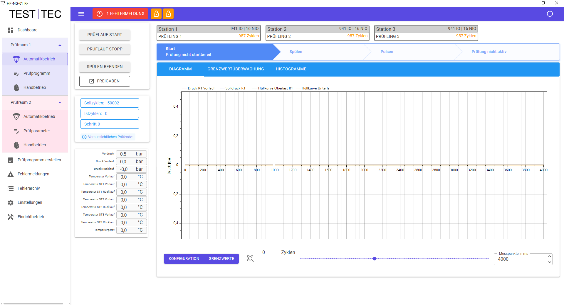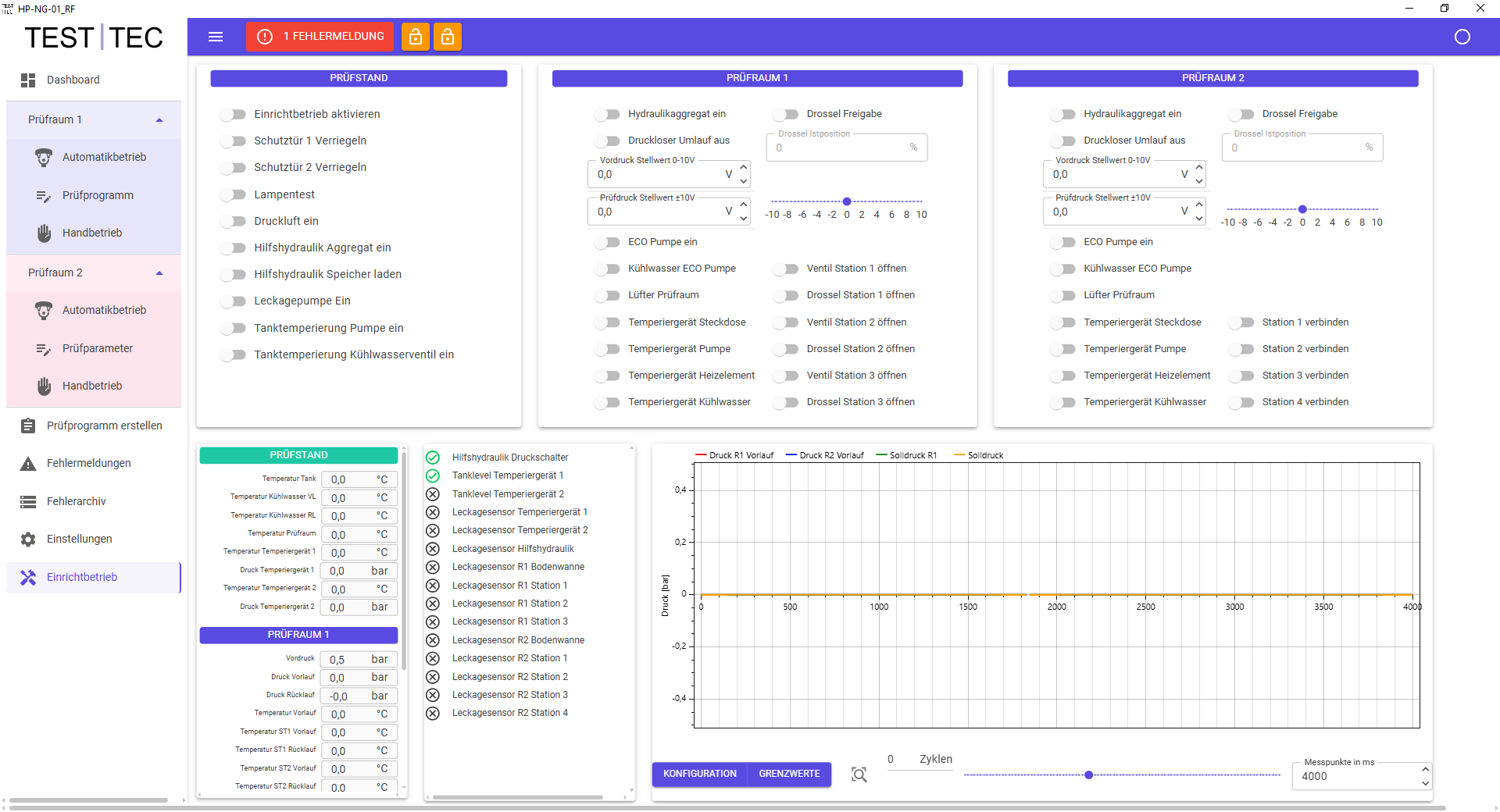 Die Prüftechnik jeder Kammer ist mit einem iterativen Regelsystem ausgestattet. Pro Prüfkammer kommen zwei Drucksensoren (Vorlauf und Rücklauf) zum Einsatz. Die Druckregelung erfolgt über die Sensoren wahlweise in der Vorlauf- bzw. der Rücklaufleitung